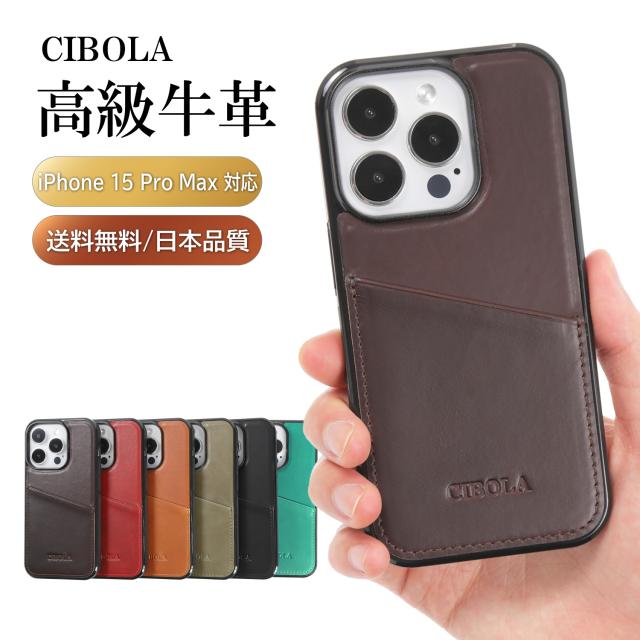 日本メーカーCIBOLA発売の高級牛革・本革 iPhone 15 Pro Max スマホ バンパーケース。機種毎デザイン、TPUソフトケースで耐衝撃、カメラレンズ保護、カードポケット付き、マグネット無し。