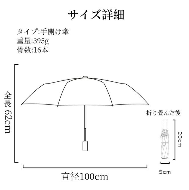 | タイプ | 折り畳み傘(16本骨)、日傘、手動開け |