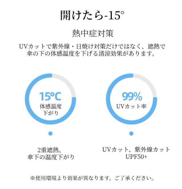 【UVカット、紫外線カット率99%以上】太陽の光は目に見える可視光線と目に見えない赤外線、紫外線があります。紫外線はさらにUVA・UVB・UVCの3種類に分かれます。UVCは大気層に吸収され、地面に届きませんが。気を付けるべきはお肌に影響を与えやすいUVAとUVBの紫外線です。弊店の日傘は専門機械でテストして、99%以上のUVカット率、紫外線カット率を実験しました。色々なお肌トラブルから守ります。