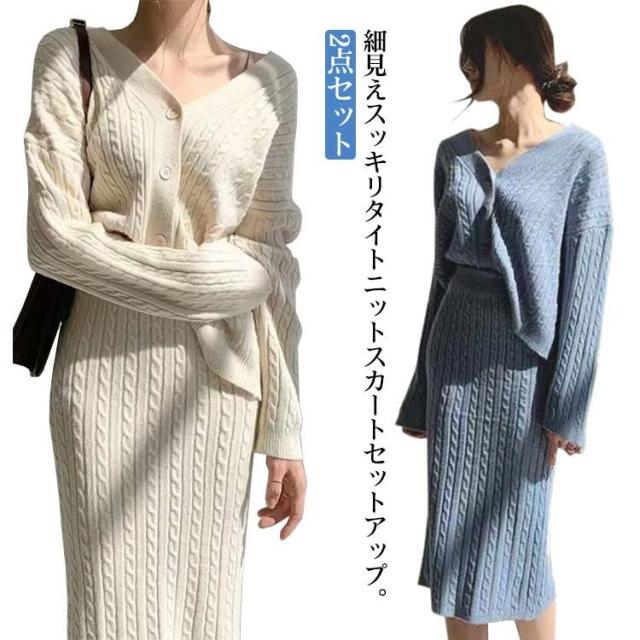 送料無料 セットアップ レディース 秋冬 ニット タイト スカート きれいめ 長袖 ロング フレアスカート マーメイドスカート ニットスカート 2点セット スカートスーツ 大人 お洒落 カーディガン OL 通勤 オフィス 出かけ 同窓会 ベージュ ブルー