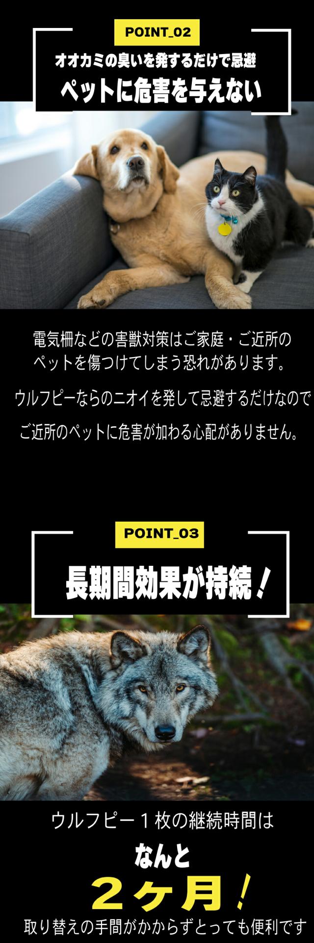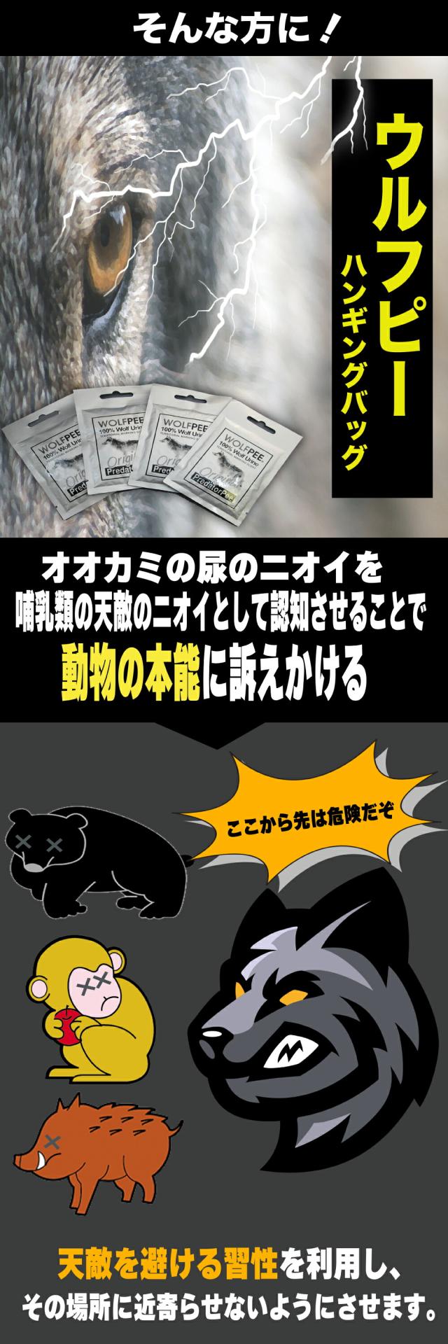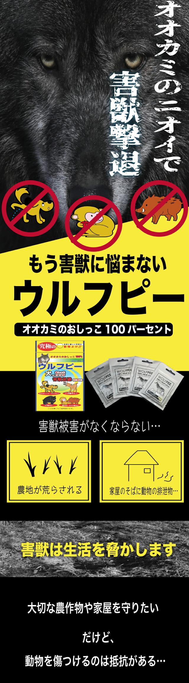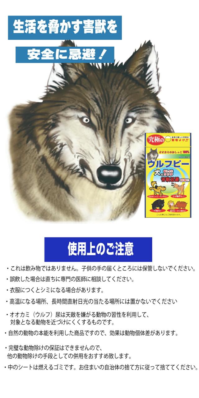 動物除け ウルフピー オオカミの尿 狼尿 狼 動物撃退 害獣撃退 害獣対策 マーキング対策 猫対策 ネコ対策 野良猫 対策 撃退 避け よけ 除け イノシシ対策 猪 猿 サル 鼠 ネズミ 犬 イヌ 狐 キツネ 狸 タヌキ 熊 クマ 鹿 シカ ハクビシン 畑 農地 高速道路 文化財 民家 天然