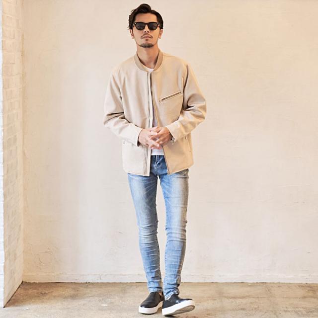 首周りをリブ仕様にすることでライダースジャケットの様なハードな印象が抜け、普段のコーデに落としやすくなっています。