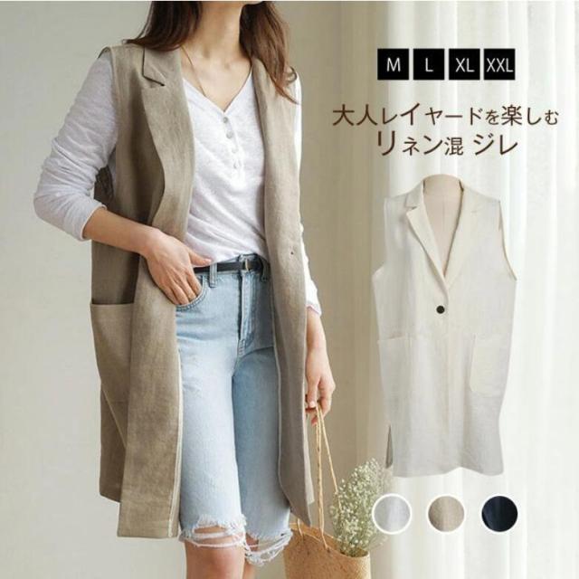 新品 ジレベスト レディース 春夏 ロングジレ リネン テーラードジレ 綿麻 トレンチベスト テーラード風 無地 ジレンチ トップス ロングベスト 春 秋 夏
