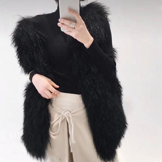 毛足が長くカールしているのが特徴的な暖かみのあるフェイクファー、ボリュームたっぷりのが大人可愛く着こなせる