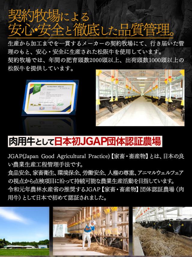 【原材料名】挽肉(松阪牛50%,国産豚50%)、植物油(国内製造)、水飴、玉ねぎ、砂糖、醤油、食塩、トマトペースト、植物油脂、コショウ末、たまねぎエキス、生パン粉、ナツメグパウダー、白キクラゲ抽出物、酵母エキス/PH調整剤、酸化防止剤(V.C)、増粘多糖類、調味料(アミノ酸等)、(一部に小麦・乳成分・牛肉・豚肉・大豆を含む)