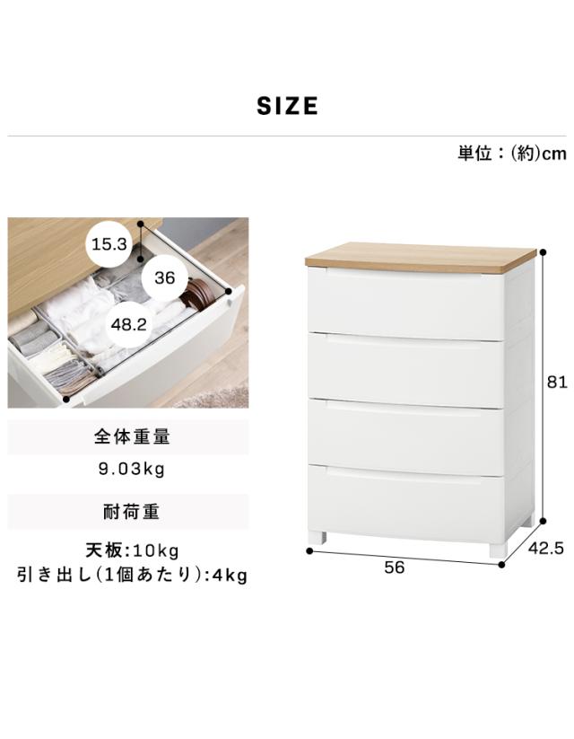 天板:5kg、引き出し(1段あたり):4kg、全体:21kg