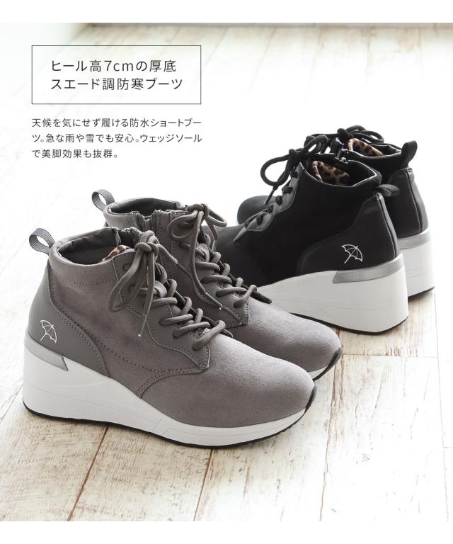 ヒール高約7cmの厚底スエード調防寒ブーツ。