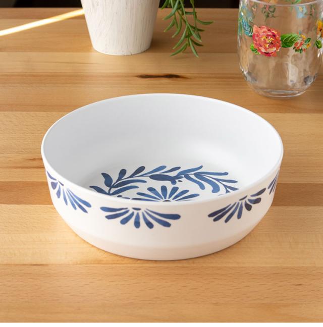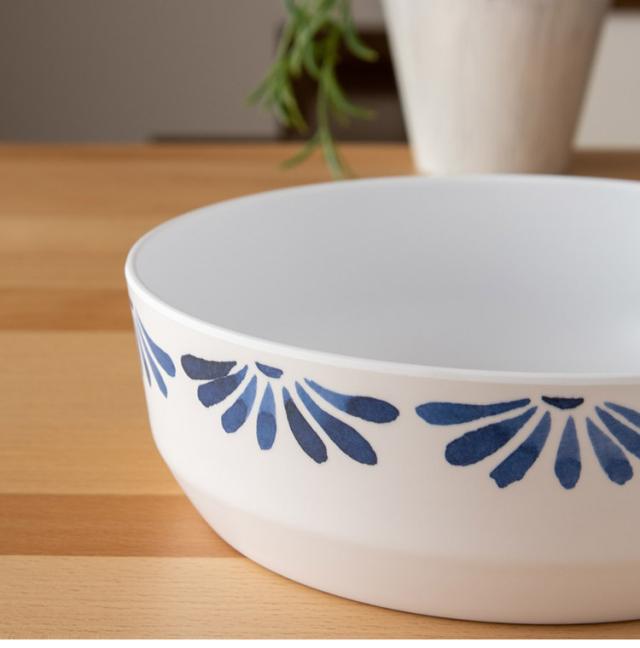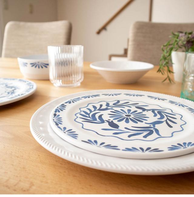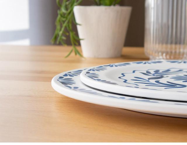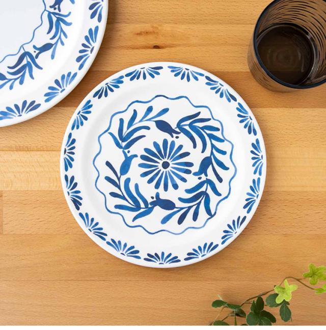 ホワイトベースにブルーのプラントデザインが特徴のメラミン食器です。青磁をイメージしたヨーロッパスタンダードデザインです