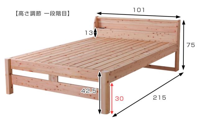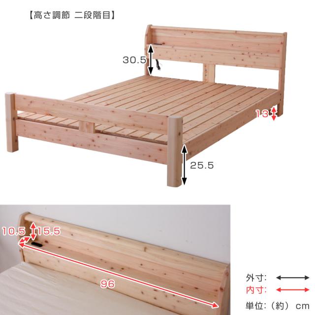 頑丈すのこベッド シングル 国産ひのき 宮棚 2口コンセント付 高さ調整可 日本製 ( ベッド ベット フレーム すのこ ノンホルムアルデヒド 耐久性 強度 通気性 調湿 天然木 木製 )