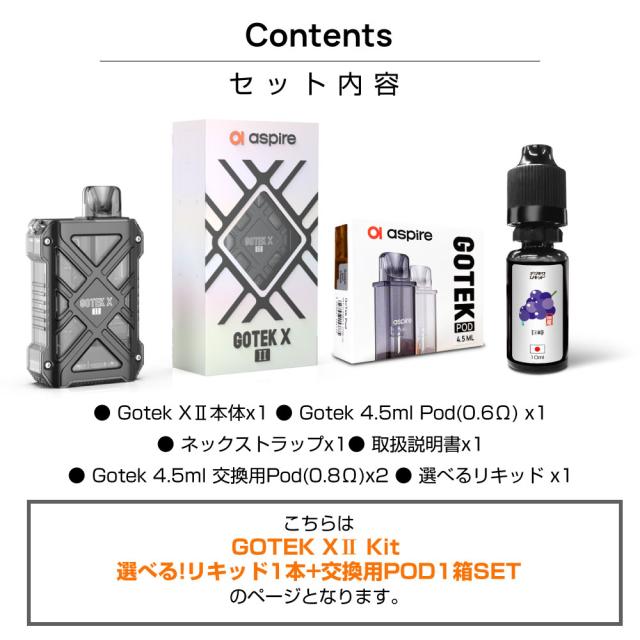 ![]() | ⇒Aspire GOTEK PRO(アスパイア ゴーテック プロ)スターターキットはコチラ 進化したGOTEK!交換用PODカートリッジ2個と選べるリキッドが1本付いた、すぐに始められるスターターセット! |