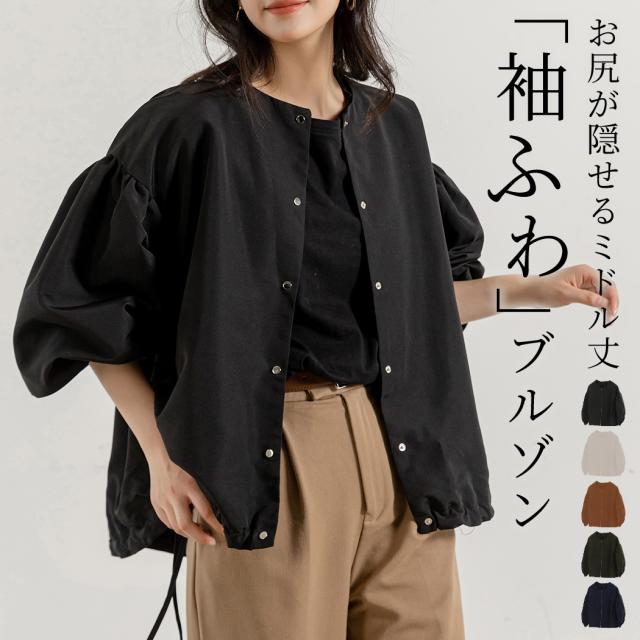 春新作 ブルゾン レディース きれいめ 春 秋 ノーカラー ライトアウター ジャンパー ジャケット バルーンスリーブ ミディアム丈 長袖 ドロップショルダー おしゃれ かわいい 黒 丸首 フロントボタン ポケット 袖ゴム ふんわり