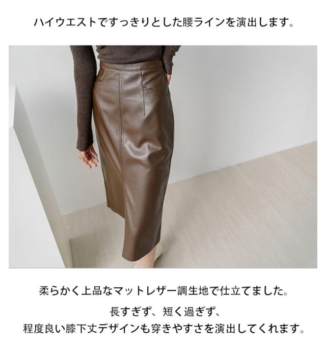 | 今季オトナ女子が着たいフェイクレザータイトスカートの登場です。 タイトなシルエットでぴったり体にフィットしてきれいなヒップラインも強調できます。 柔らかく上品なマットレザー調生地で仕立てました。 長すぎず、短く過ぎず、程度良い膝下丈デザインも穿きやすさを演出してくれます。 ハイウエストですっきりとした腰ラインを演出します。 フロントスリット×バック隠れファスナー付きで着やすさ抜群。 トップスをインしてコンパクトにまとめると、バランスの良い着こなしに。 | |