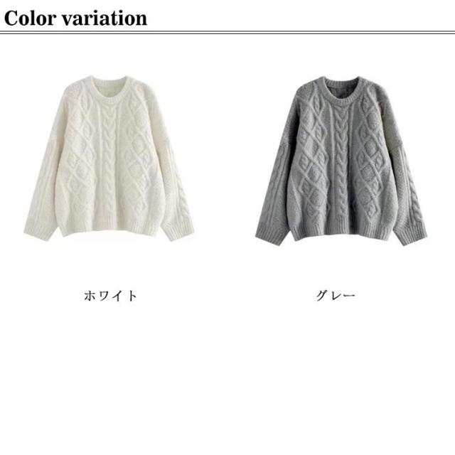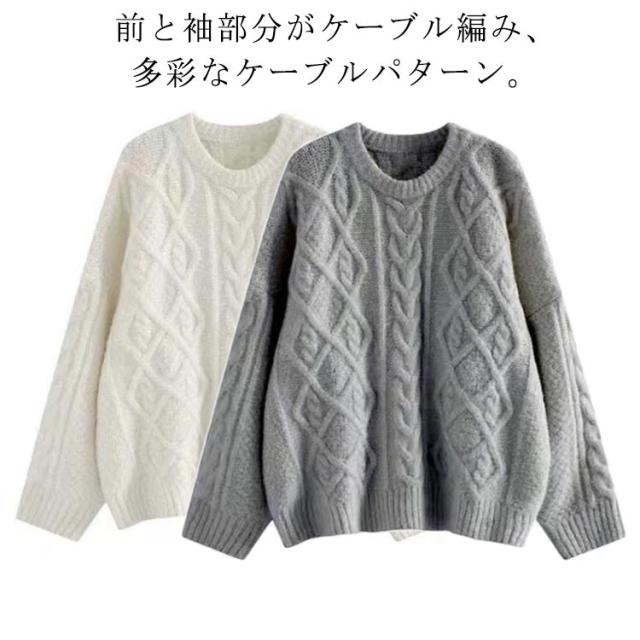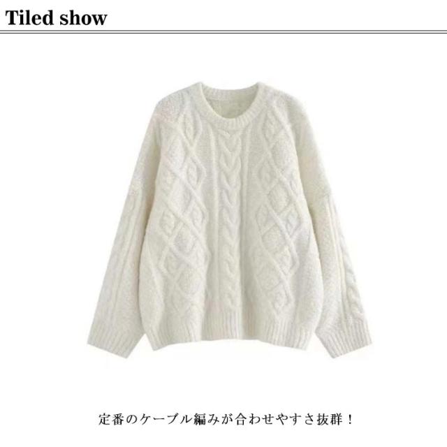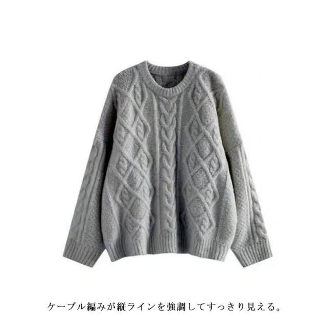 | 前と袖部分がケーブル編み、多彩なケーブルパターン。 定番のケーブル編みが合わせやすさ抜群! ケーブル編みが縦ラインを強調してすっきり見える。 ゆったりのデザイン、軽い素材で気軽に着れる トレンド問わず長く使えるので重宝間違いなし 厚手すぎないので、着こみやすい。 スカート合わせで女性らしさを強調する。 パンツ合わせでカジュアルスタイルでも着こなせる。 | |