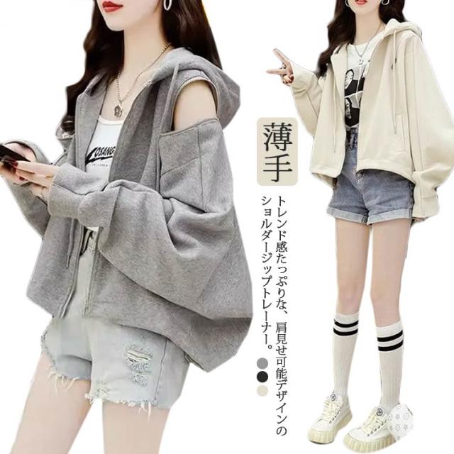 フードパーカー レディース 肩だし トレーナー 肩出し スウェット パーカー ジップ ファスナー アウター トップス 長袖 パーカー 肩見え 春 秋 カジュアル ストリート 薄手 フード付き オフショルダー 肩見せ 肌見せ 個性的 オーバーサイズ