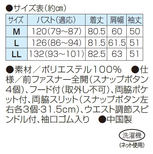 ット付、両脇スリット(スナップボタン左右各3個・31.5cm)、ウエスト調節スピンドル付、袖口ゴム入り