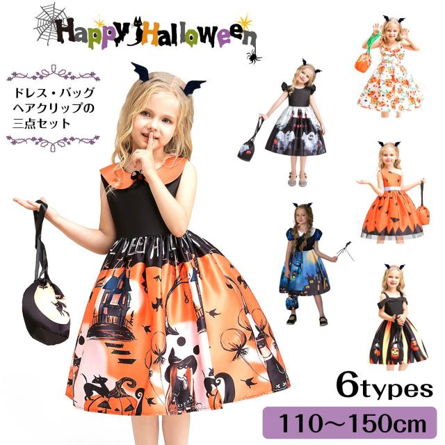 ハロウィン ドレス 仮装 3点セット 子供 キッズ ドレス 可愛い コスチューム 魔女 ウィッチ カボチャ パンプキン ワンピース レース コスプレ 衣装 子供用 キッズドレス 子供ドレス ハロウィンパーティー お化け パーティー