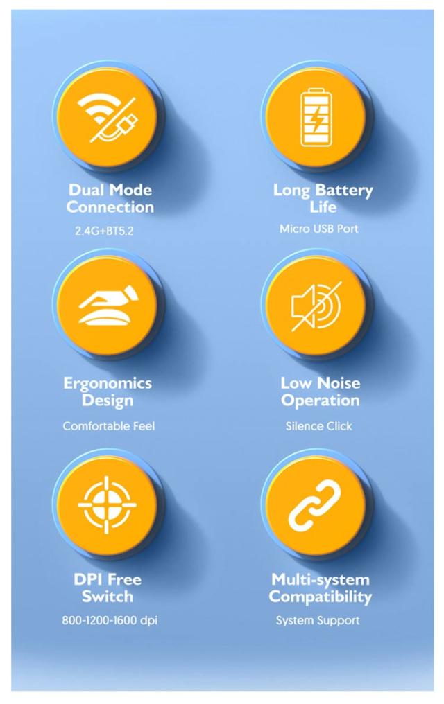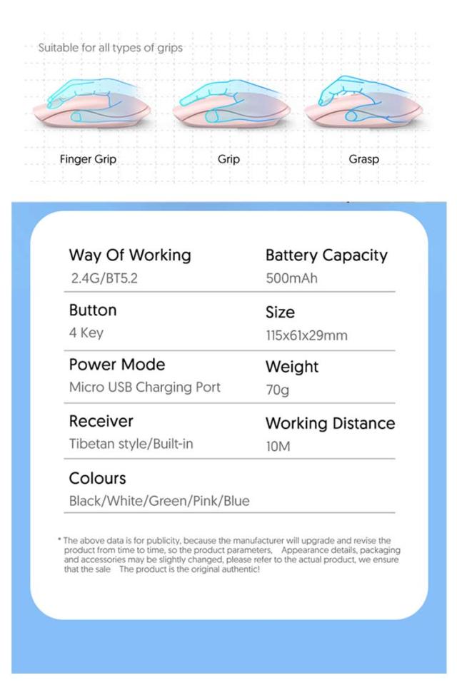 | サイズについての説明 | 製品仕様 内容物:マウス本体、USB充電ケーブル 精度:800/1200/1600dpi(切替可能) 外形寸法:幅61×奥行115×高さ29mm 有効範囲:10メートルまで センサー方式:光学式 伝送方式:bluetooth/ワイヤレス2.4G 充電:USB充電 電池容量:500mAh |