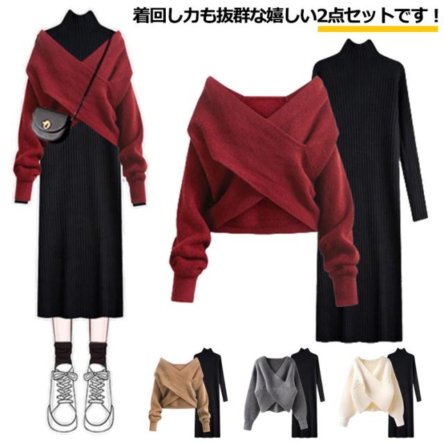 クロスニット ニットワンピース 上下セット セットアップ レディース 長袖 セーター タートルネック トップス ロングワンピース フェミニン 女性 通勤 通学 カジュアル きれいめ 春秋 無地 送料無料