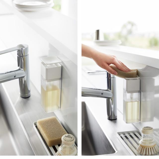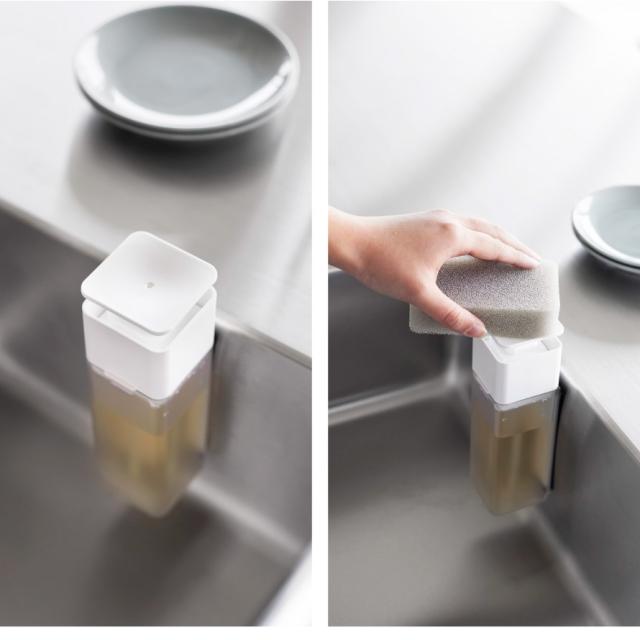 マグネットで壁面に浮かせて収納できるディスペンサー。片手で押すだけでスポンジに直接洗剤がついて便利。そのままポンプを押せます。