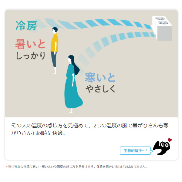 その人の温度の感じ方を見極めて、2つの温度の風で暑がりさんも寒がりさんも同時に快適。