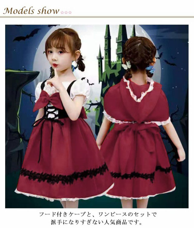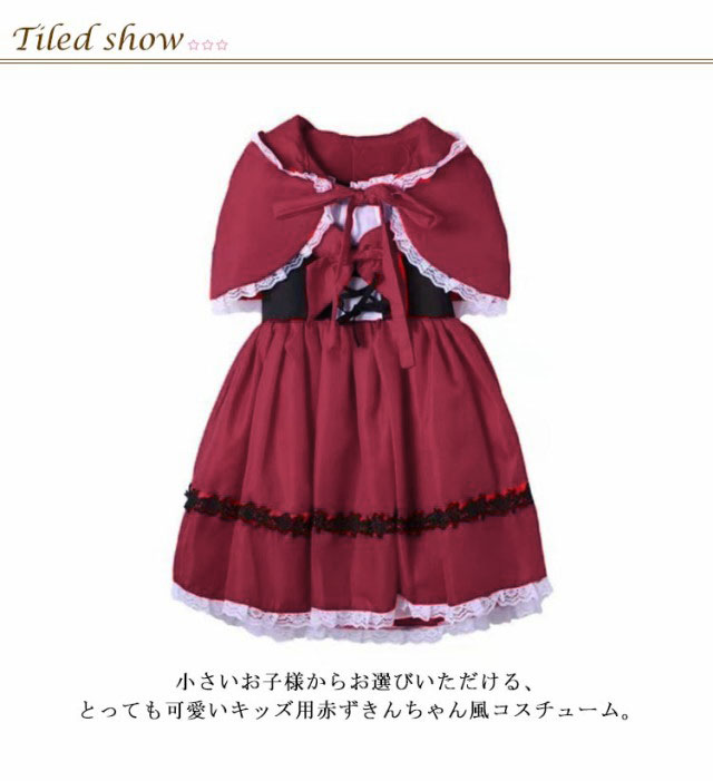 | ハロウィンやコスプレパーティーなど仮装の大定番、赤ずきんスタイル! フード付きケープと、ワンピースのセットで派手になりすぎない人気商品です。 胸元ギャザーでふわっと、ウエストは編み上げ仕様でキュッとまとめ体のラインにもこだわっています! 前後に大きな赤いリボンがついていて、より赤ずきんちゃんに見える! 小さいお子様からお選びいただける、とっても可愛いキッズ用赤ずきんちゃん風コスチューム。 ハロウィーンパーティーはもちろん、お祭りやお遊戯会、学園祭、文化祭、発表会、お誕生会、クリスマス、イベント時などのcosplay 衣装にオススメ。 | |