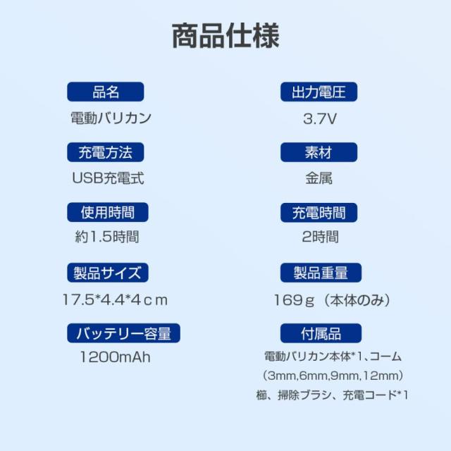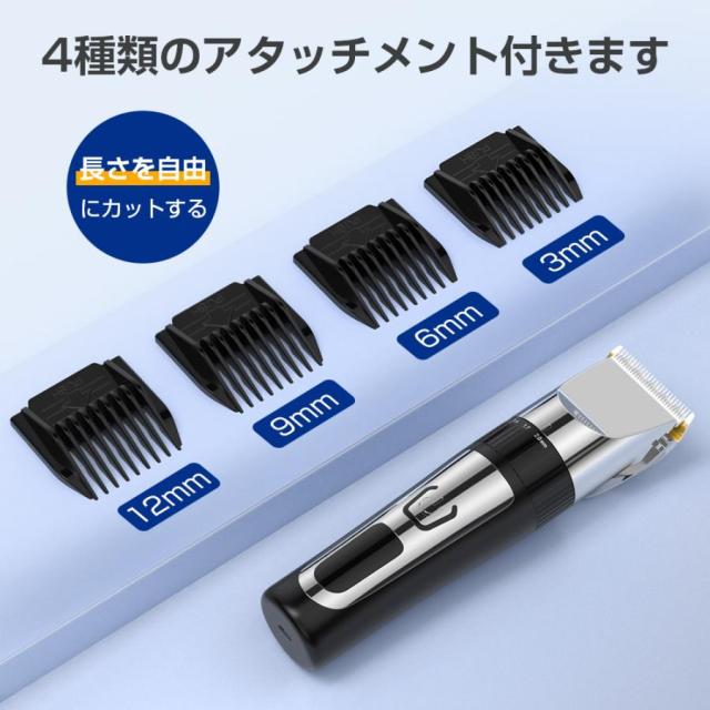 セット内容:本体*1、コーム*4(3.0mm/6.0mm/9.0mm/12.0mm)、櫛、充電ケーブル