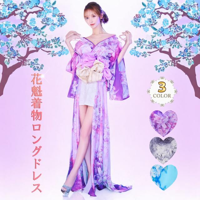 胸元のVカットとフラワープリントが華やかな花魁着物ロングドレス。