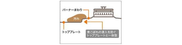 煮こぼれなどが器具内に侵入しにくいシールドトップ。汁受け皿がないから、拭き掃除がラクラクです。