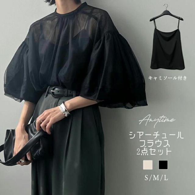 【超目玉】送料無料 2色 シアーチュールブラウス 2点セット キャミソール ブラウス バルーン袖 バルーンスリーブ パフスリーブ 黒 白 ブラック ホワイト S M L 通勤 OL 2023 夏 INS 春秋 ゆったり【Anytime】