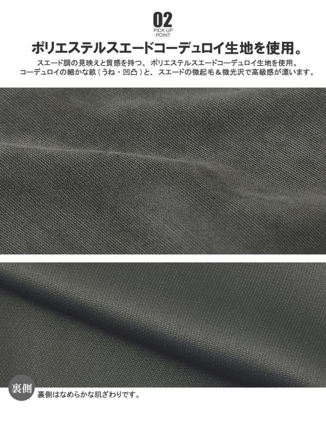 本品には、スエード調の見映えと質感を持つ、ポリエステルスエードコーデュロイ生地を使用。