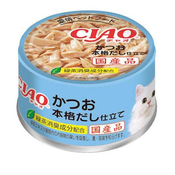 | 原材料 | ●原材料 かつお、かつお節エキス、昆布エキス、でん粉、増粘多糖類、増粘剤(加工でん粉)、ビタミンE、緑茶エキス ●保証成分値 たんぱく質 13.5%以上、脂質 0.5%以上、粗繊維 0.1%以下、灰分 1.3%以下、水分 85.0%以下、約60kcal/缶 |