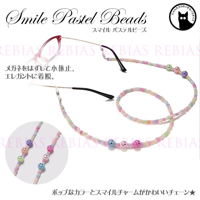 メガネチェーン スマイル パステルビーズ 眼鏡 ネックロープ 首掛け フリーハンド