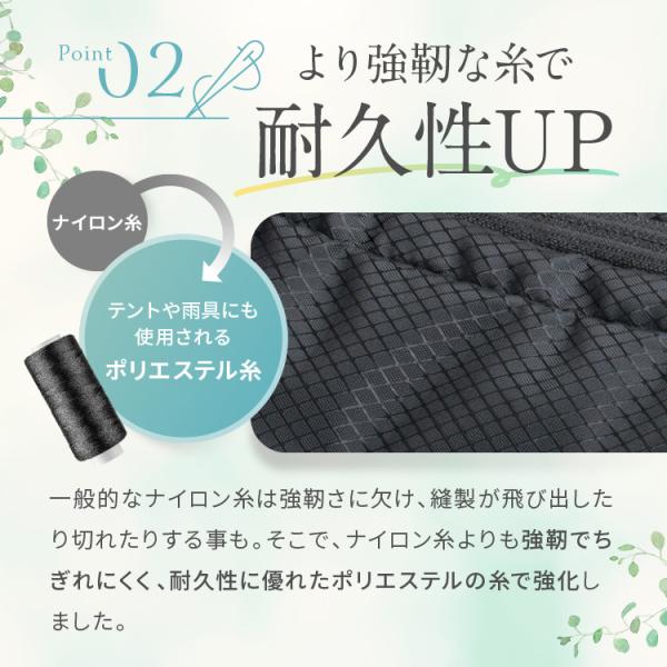 | 2番目に多かった声が、容量の問題です。 一般的な圧縮袋は広げた際のマチが12cmほどに対し、コペルタの圧縮バッグは17cmに拡張しました! マチだけを広げたので、 圧縮した際の大きさは変わらずに、広げた際の大きさだけ拡張することに成功しました | 糸をより強靭な糸に! |
