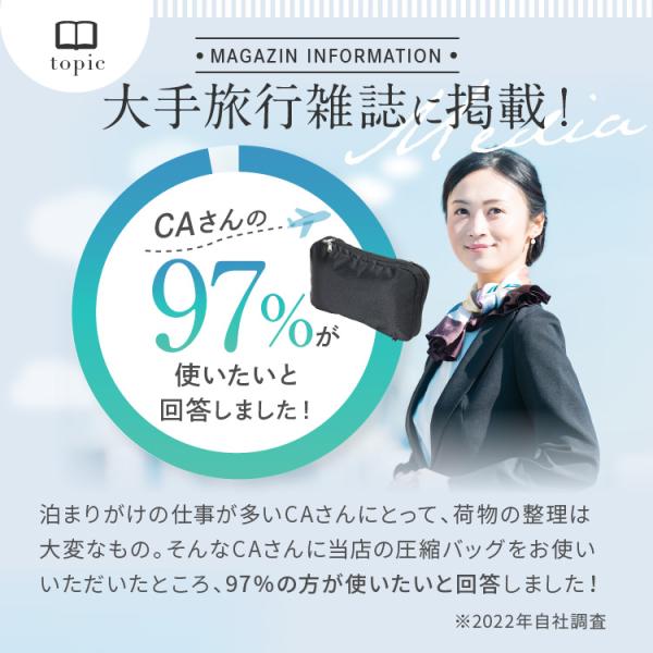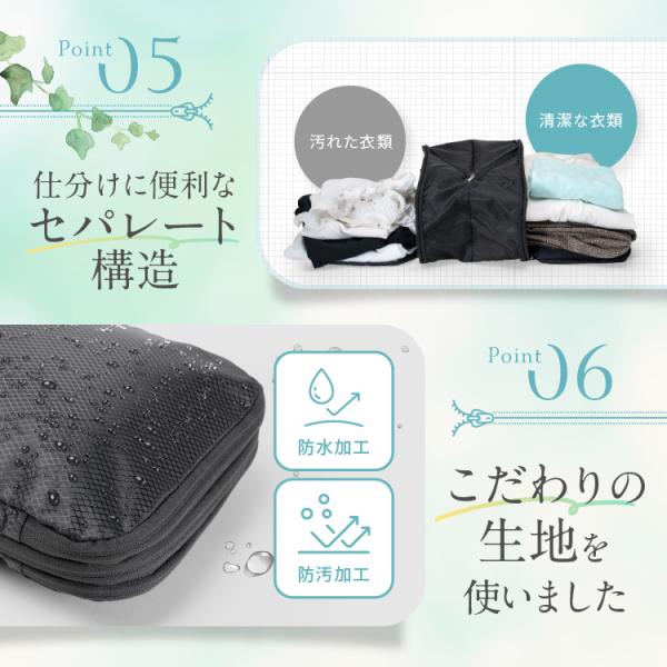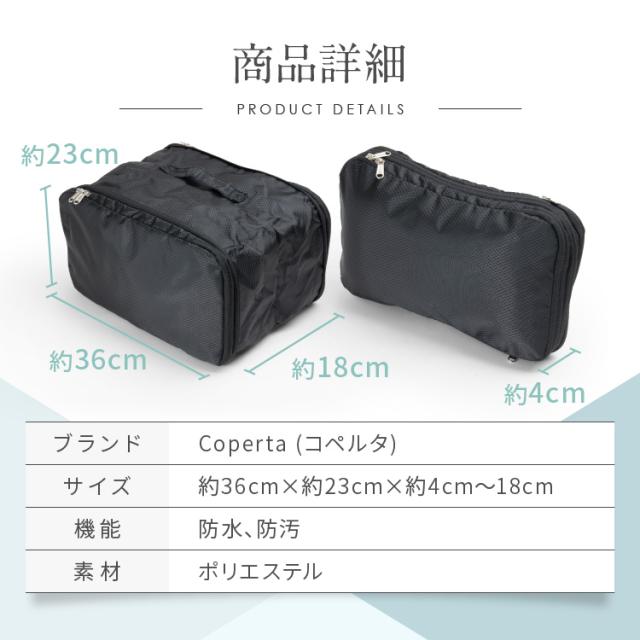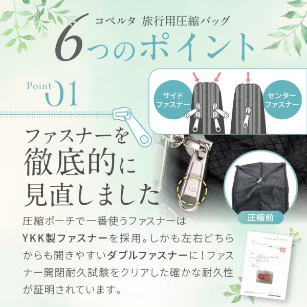| コペルタの旅行用圧縮袋はファスナーを閉めるだけで、かさばる荷物が一気にスリムに! トラベルポーチに衣類を入れた後、ファスナーを閉めることでスーツケース内のスペースを約50%節約することができ、スッキリ整理整頓されます。収納が苦手な方でも簡単に整理できます | 生地にもこだわりました |
