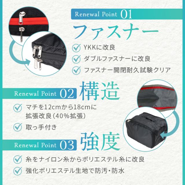 | 圧縮ポーチで一番使う箇所は、ずばり”ファスナー”です。 そこでコペルタの圧縮ポーチは、YKK製のファスナーを採用し、さらに左右どちらからも開きやすいダブルファスナーにしました! そして、ファスナー開閉耐久試験を無事にクリアし、確かな耐久性を証明しました! | マチを最大限に拡張しました♪ |