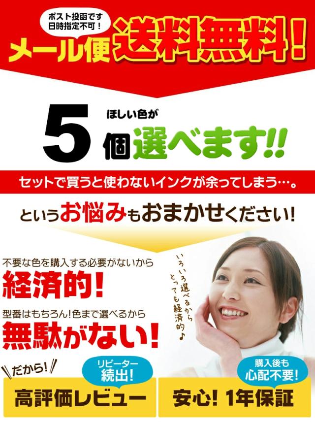 - 5個セットで送料込みで安価ですが、好きな色を組み合わせて購入できるのがいいです。各インクの消費量が異なるので、このような注文ができるのは便利ですね。