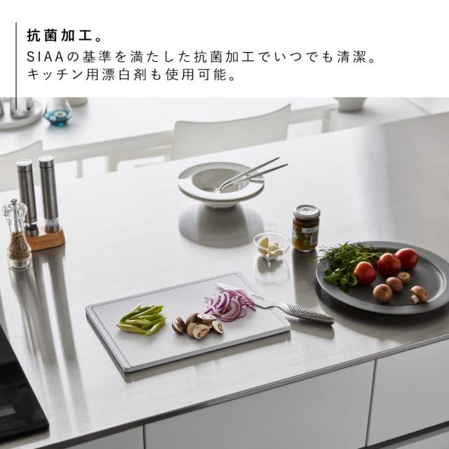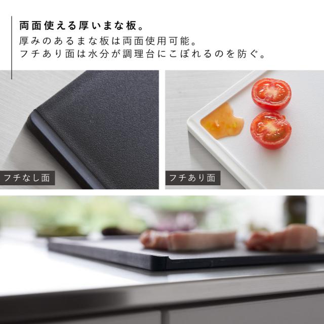 厚みのあるまな板は、滑り止め付きでスムーズに食材をカットできます。片面はフラットで大きな食材もカットしやすく、もう片面はフチが付いており、水分が調理台にこぼれるのを防ぎます。食洗機対応です。