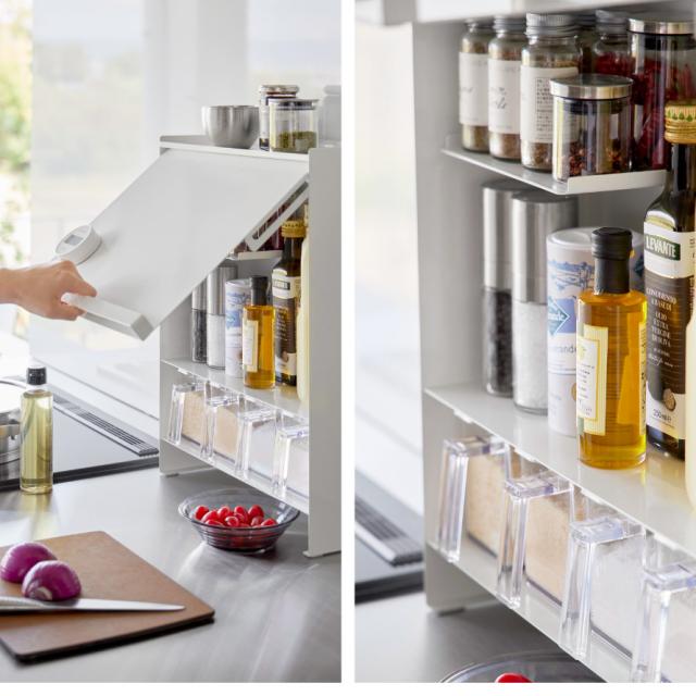 調味料ボトルやスパイス類を隠して収納。汚れをガードする扉付きラック。