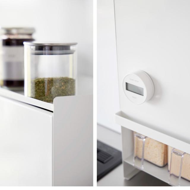 マグネットで取り付けるスパイス棚付き。スパイスの高さに合わせて棚をつけられるので、上下に分けてたくさん収納できます。
