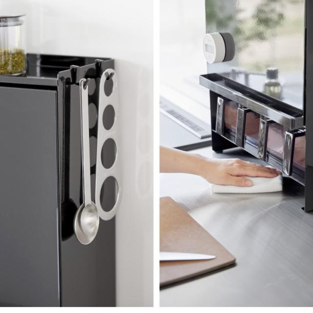 付属のフックで計量スプーンなどのキッチン小物も収納可能。