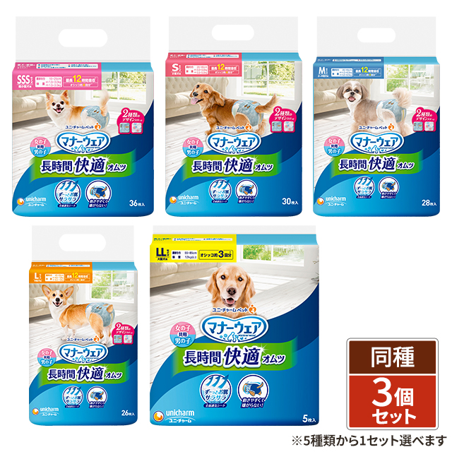 商品名 マナーウェア 長時間オムツ ( 女の子・男の子共用 ) ×3個セット ブランド ユニ・チャームペット メーカー ユニ・チャーム バリエーション SSS 36枚入り×3個、S 30枚入り×3個、M 28枚入り×3個、L 26枚入り×3個、LL 5枚入り×3個 容量 SSS 36枚入り×3個