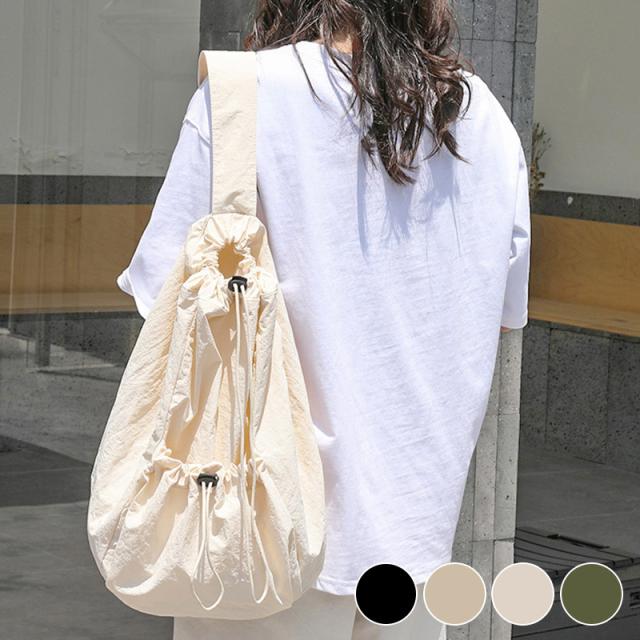 ワンショルダーバッグ レディース 鞄 斜め掛けバッグ 使いやすい ボディバッグ 巾着型 軽量 黒 A4収納 23L 肩ひも 幅広 ドローストリング 広い 開口部 ポケット 出し入れしやすい シャカシャカ 生地 カジュアル 無地 シンプル 普段使い デイリー 旅行