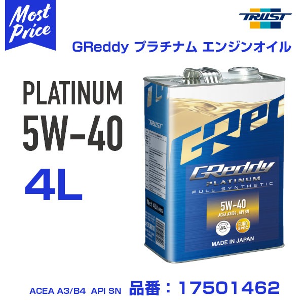 TRUST トラスト GREDDY エンジンオイル プラチナム 5W-40 4L 【17501462】 | グレッディ 100% 化学合成油 ENGINE OIL PLATINUM 5W40 4リッター 全合成油 EURO SPEC ACEA A3 B4 API SN リピート多数 おすすめオイル