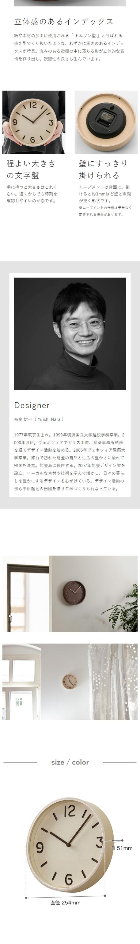 ナチュラルな印象でインテリアになじむ木製ウォールクロック『 Lemnos トムソン 』。トムソン型と呼ばれる木型で素材を打ち抜く加工技術のように、文字盤の指標をくり抜いて表現したユニークなデザインです。くり抜かれた指標の内側に影が落ちることで立体的に浮き上がらせ、見やすさもアップ。直径約10インチの程よい大きさと温かみのあるカラーで、リビングやダイニング、子供部屋への設置もおすすめ。秒針がなく静かなので寝室に置きやすいのも魅力です。