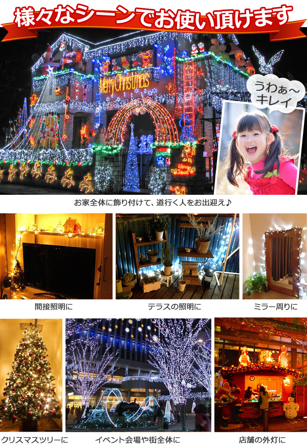 ◆クリスマスの定番人気LEDイルミネーションライト。ご家庭やお店、広場やパーティ会場を綺麗に彩ります。