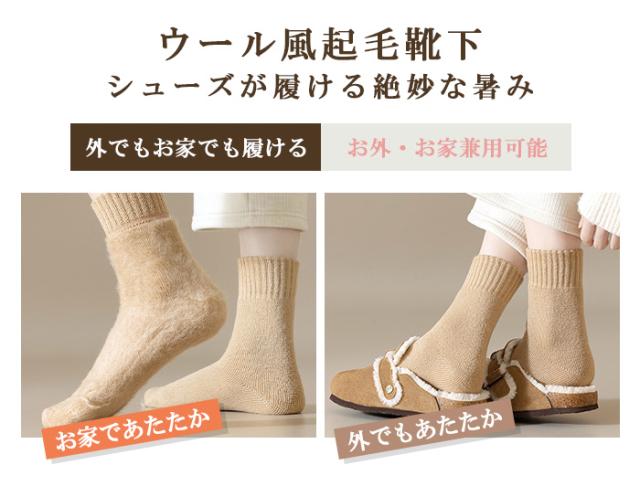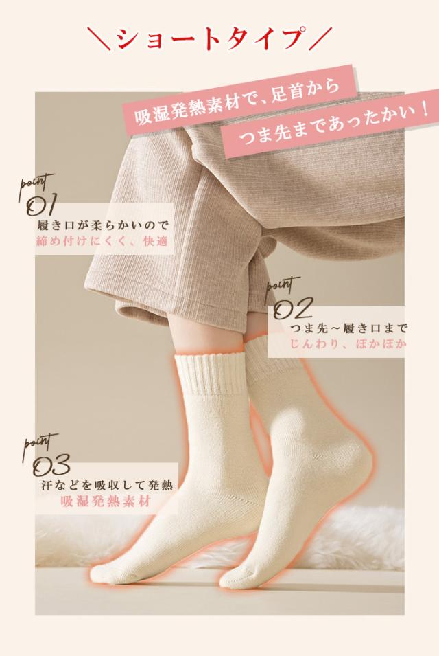 冷えが気になる秋冬シーズンにぴったりの裏起毛靴下。 内側の裏起毛が足を優しく包み込み、 ふんわりとした履き心地と暖かさを提供します。 ウールタッチの素材で、 快適な温かさが長続き。 |