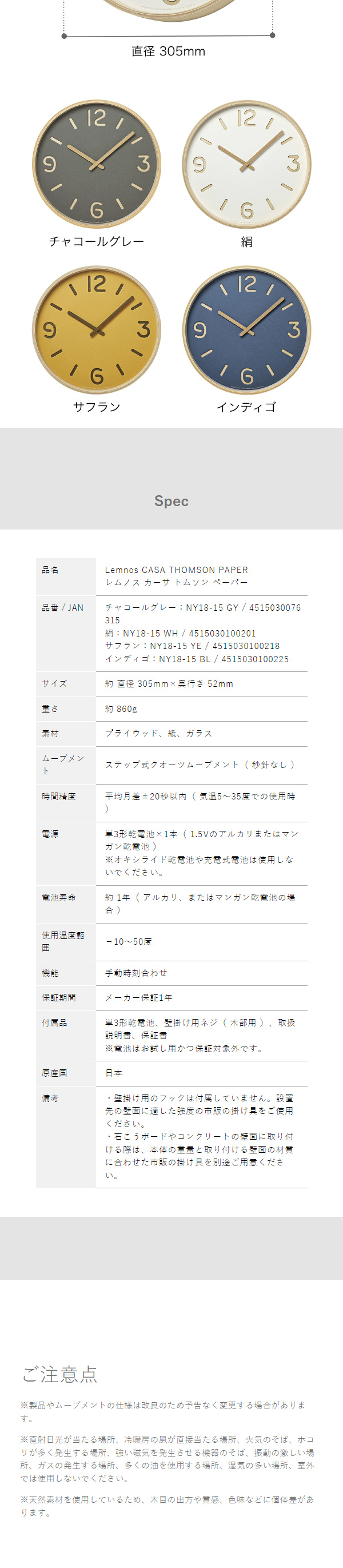 [ CASA THOMSON PAPER 30.5cm ]レムノス 掛け時計 壁掛け時計 トムソン ペーパー おしゃれ シンプル ウォールクロック 壁掛け 掛時計 かけ時計 北欧 リビング インテリア タカタレムノス NY18-15【送料無料】