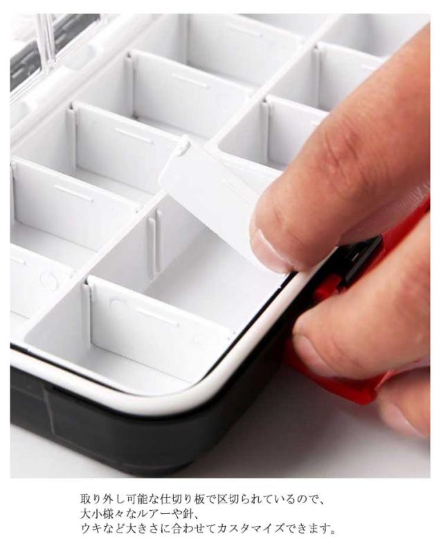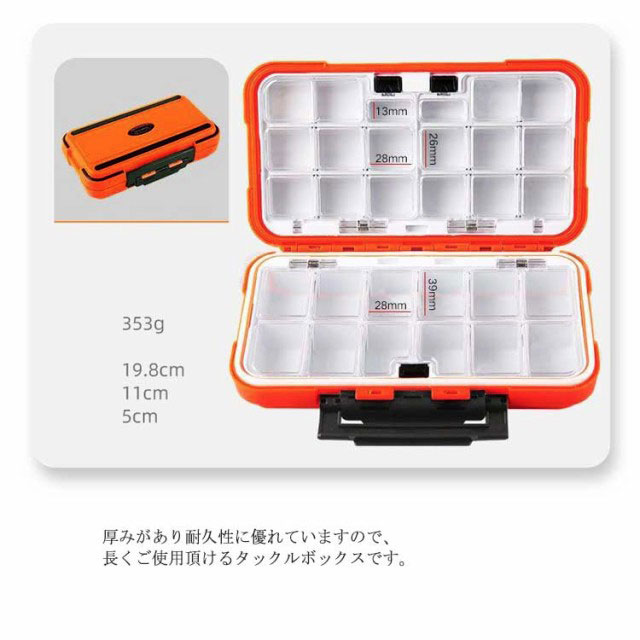 | 収納力抜群の釣り道具ケースです。 蓋付きで仕切りがあり、ルアー、フック等の釣り道具をすっきり分けて収納できます。 小さな釣り具アクセサリーの収納にとっても便利♪ 厚みがあり耐久性に優れていますので、長くご使用頂けるタックルボックスです。 取り外し可能な仕切り板で区切られているので、大小様々なルアーや針、ウキなど大きさに合わせてカスタマイズできます。 調度良い大きさがありと軽量なのでどこに行くにも持ち運び便利です。 休日の釣り、アウトドアやキャンプに持っていってもかさばらず気軽に楽しめます。 | |