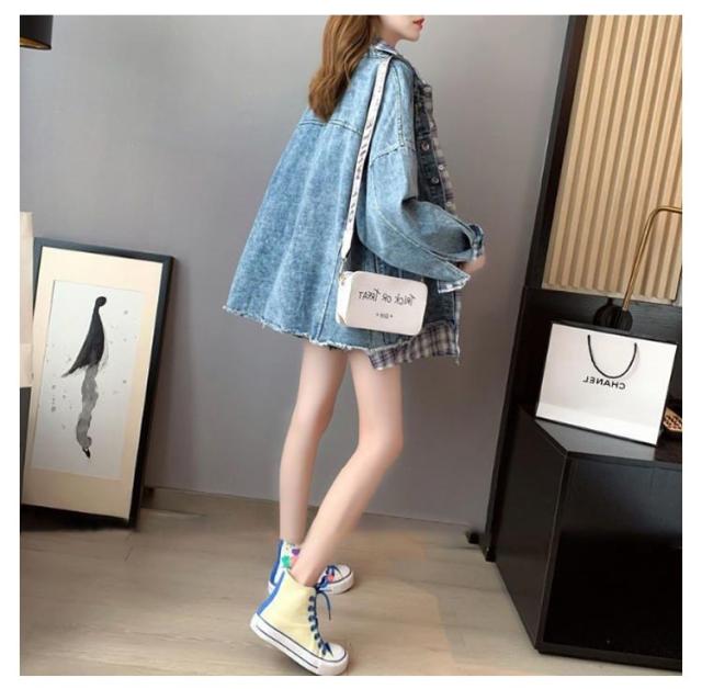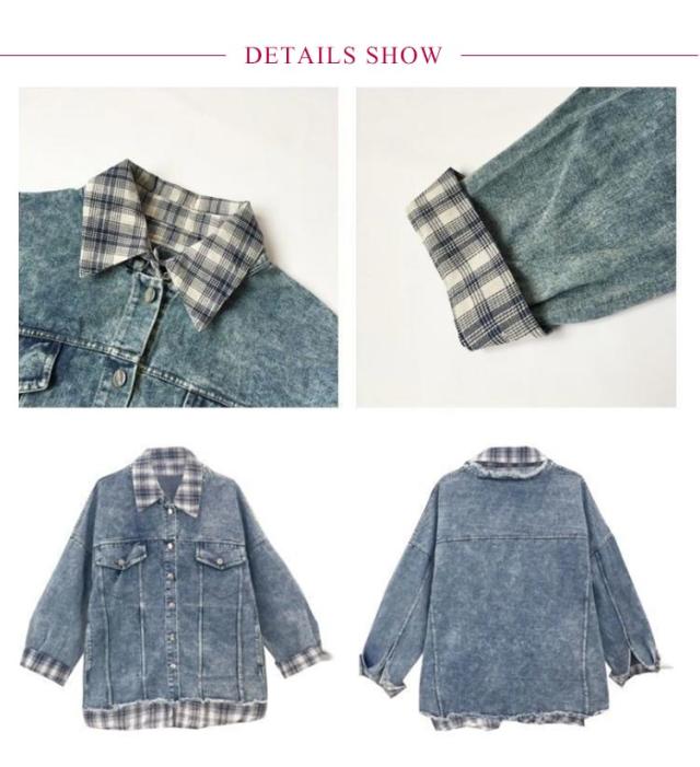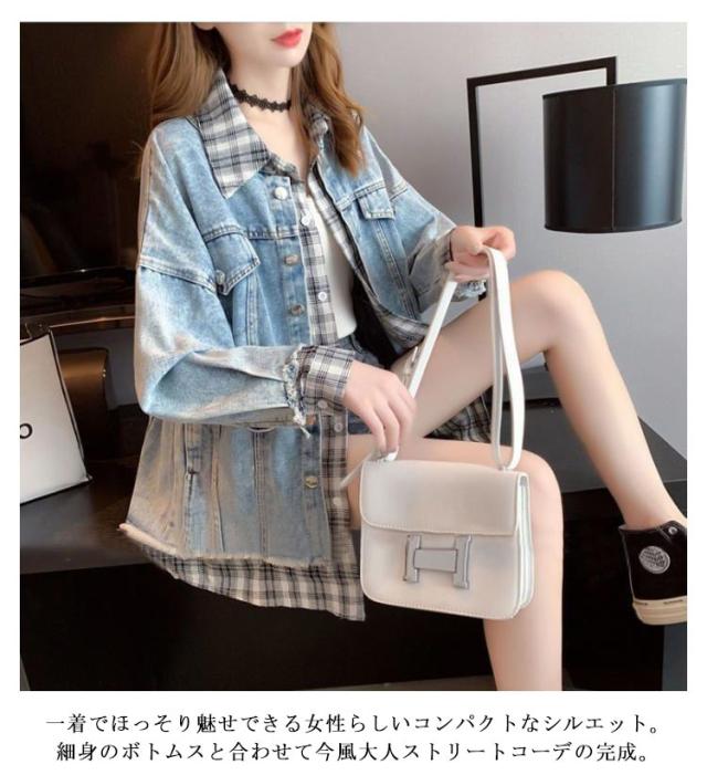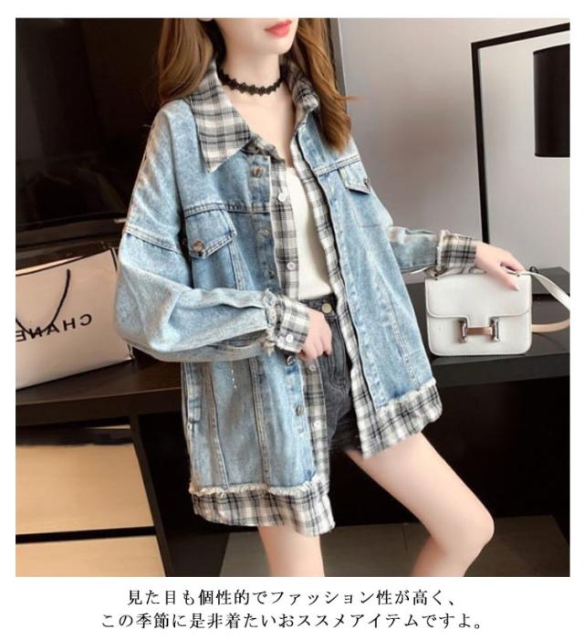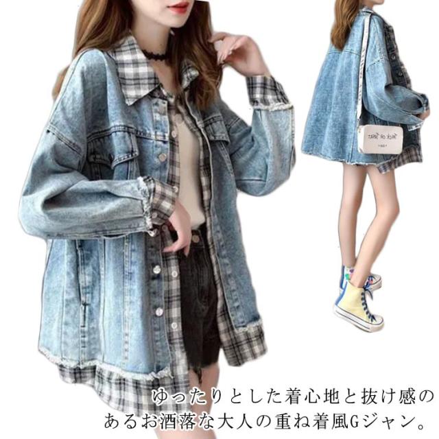 デニム デニム デニムジャケット レディース ジャケット 羽織 重ね着風 ジャケット Gジャン ジャケット ジージャン オーバーサイズ ビッグシルエット チェック ポケット カジュアル 春コート 通勤 通学 デート お出かけ フェイクレイヤード