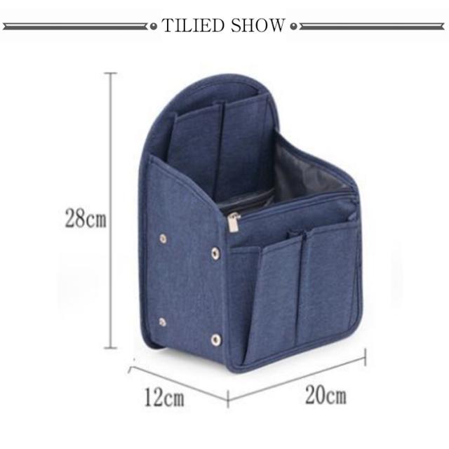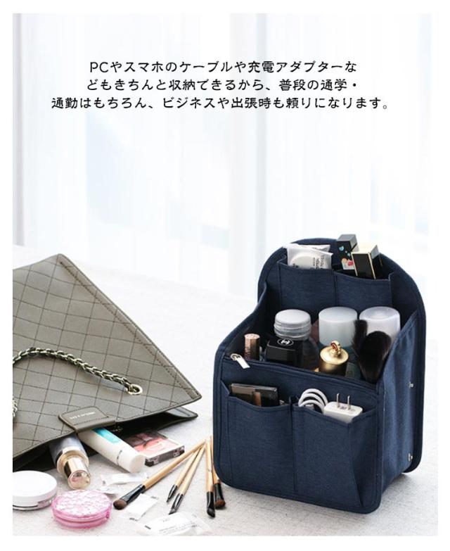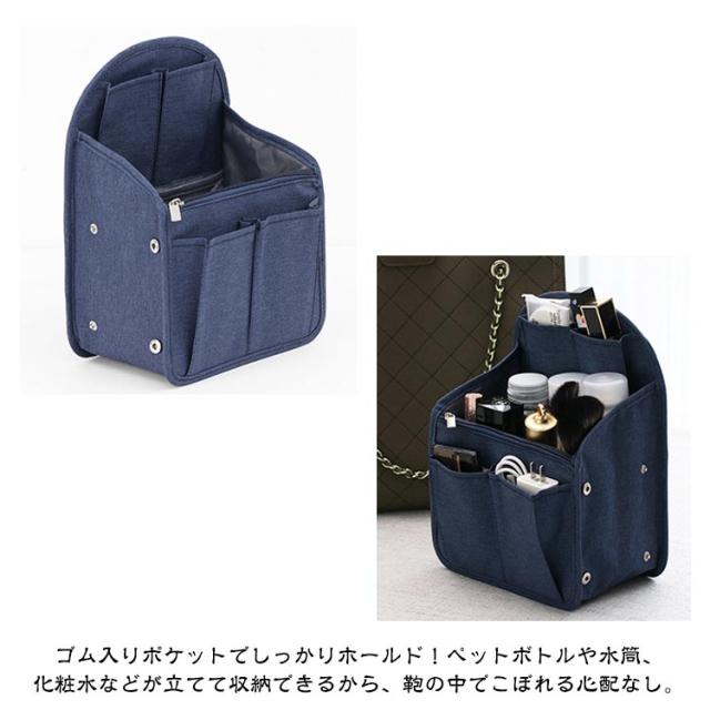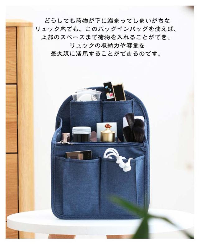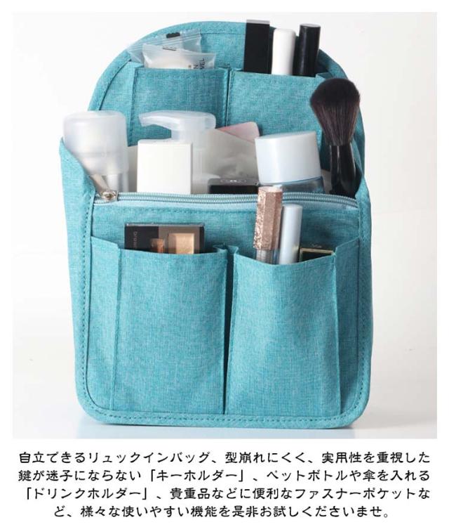 | 上部のスペースまで荷物を入れることができリュックインバッグ。 どうしても荷物が下に溜まってしまいがちなリュック内でも、このバッグインバッグを使えば、上部のスペースまで荷物を入れることができ、リュックの収納力や容量を最大限に活用することができるのです。 広めのマチでたっぷり収納できるバッグインバッグ、スナップボタンでマチの調節も自由。リュックのサイズや荷物に合わせて調節できます。 オープンポケットやゴム入りポケット、ファスナーポケットなど充実なポケットであなたも整頓上手! ゴム入りポケットでしっかりホールド!ペットボトルや水筒、化粧水などが立てて収納できるから、鞄の中でこぼれる心配なし。 PCやスマホのケーブルや充電アダプターなどもきちんと収納できるから、普段の通学・通勤はもちろん、ビジネスや出張時も頼りになります。 背面にはオープンポケットとハンドルが付いているので中身はそのままでバッグ・リュックだけを変えたい時にもスムーズに入れ替えが可能です。 丈夫なオックスフォード生地を採用し、水洗いできるからいつも清潔に。さらに、撥水加工が施され、汚れがつきにくく、お手入れ簡単! 自立できるリュックインバッグ、型崩れにくく、実用性を重視した鍵が迷子にならない「キーホルダー」、ペットボトルや傘を入れる「ドリンクホルダー」、貴重品などに便利なファスナーポケットなど、様々な使いやすい機能を是非お試しくださいませ。 | |